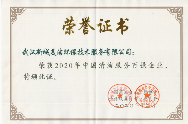 2020年中國清潔服務(wù)企業(yè)百強企業(yè)(榮譽證書)